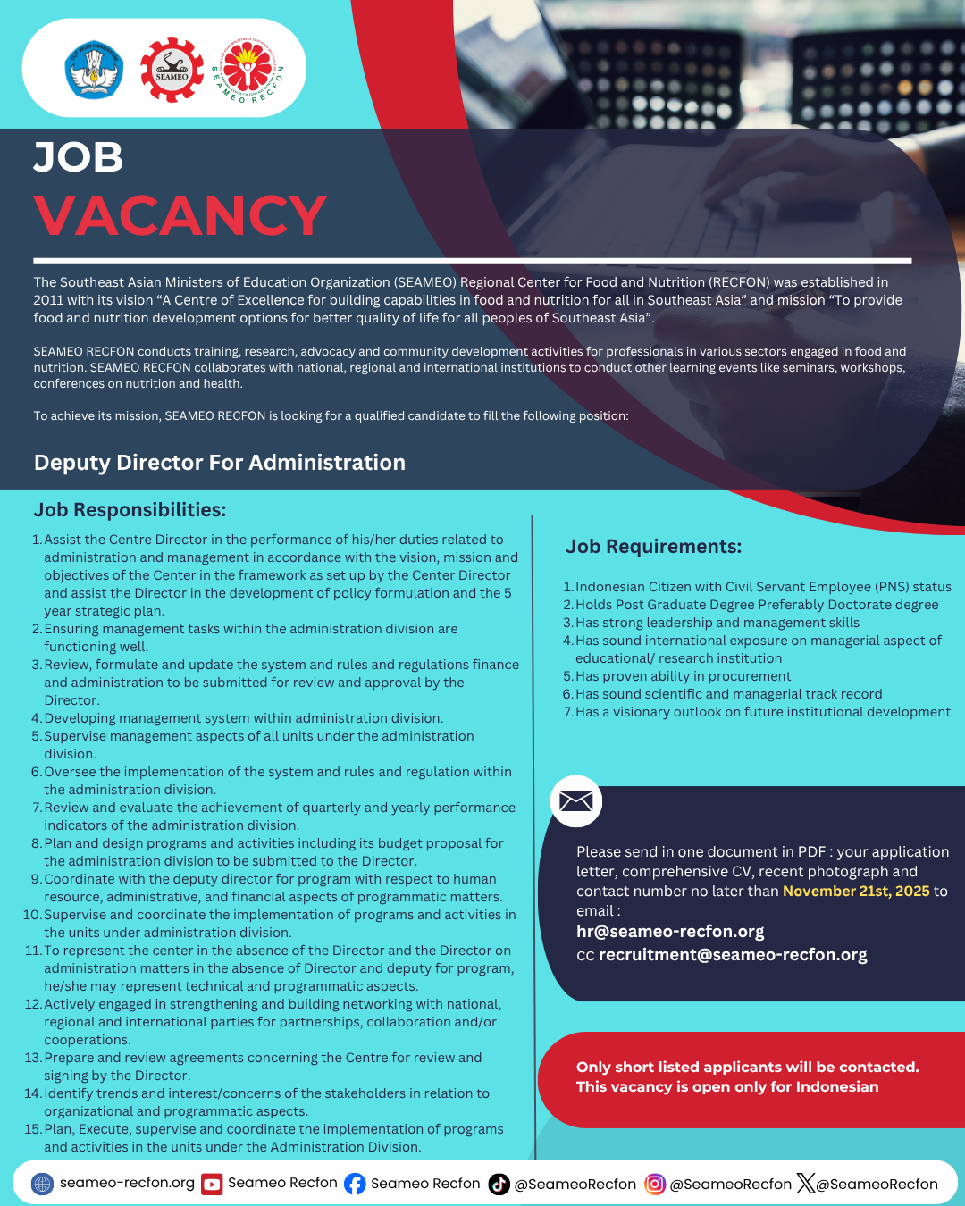 SEAMEO RECFON is looking for a qualified candidate to fill the following position: