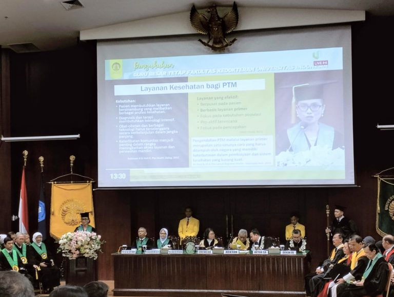 Prof. dr. Indah Suci Widyahening, M.S., M.Sc.CM-FM., Ph.D., Sp.K.K.L.P., Subsp.C.O.P.C was one of the Full Professors inaugurated at the event. In her speech, entitled “Peran Spesialis Kedokteran Keluarga Layanan Primer dalam Menjembatani Kesenjangan Pengendalian Mendukung Pencapaian Target Pembangunan di Bidang Kesehatan (The Role of Family Medicine Specialists in Primary Care in Bridging the Gap in Control to Support the Achievement of Development Targets in the Health Sector)”, she stated that reducing the relative risk of premature death due to Non-Communicable Diseases (NCDs) by one-third in 2030 is one of the sustainable development targets in the health sector.