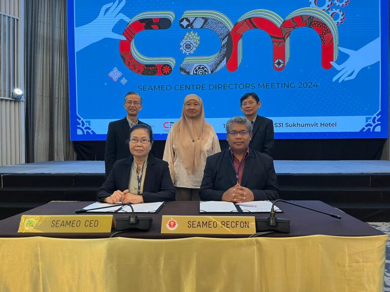 SEAMEO RECFON and SEAMEO CED (Community Education Development) signed a Memorandum of Agreement (MoA) on 17 July 2024 in Bangkok during the Centre Directors Meeting (CDM). The MoA was signed by Dr. Herqutanto (Director SEAMEO RECFON) and Dr. Niane Sivongxay (Director SEAMEO CED). In this opportunity, Dr. Zainun Misbah, the Deputy Director for Administration of SEAMEO RECFON represented Dr. Herqutanto.