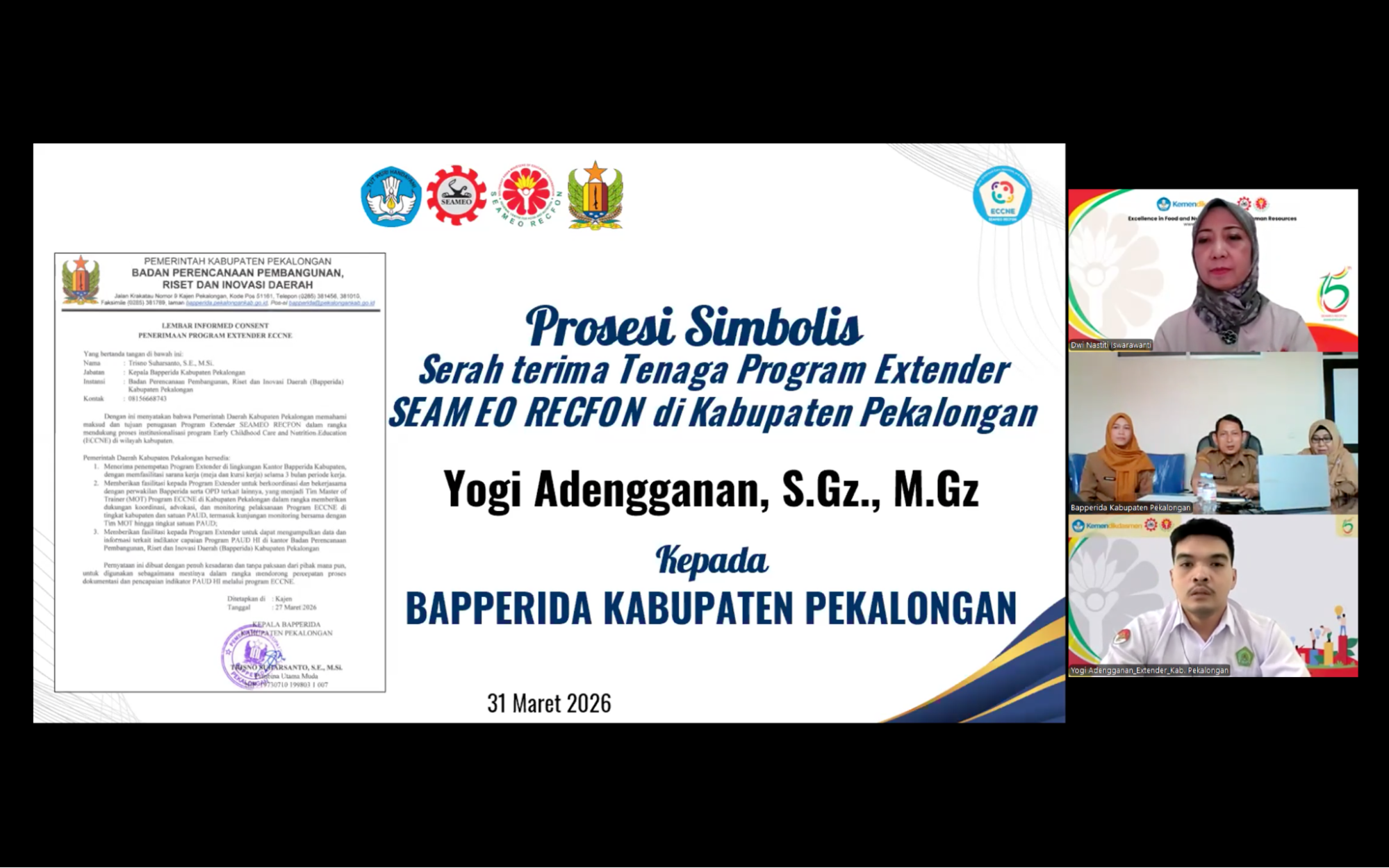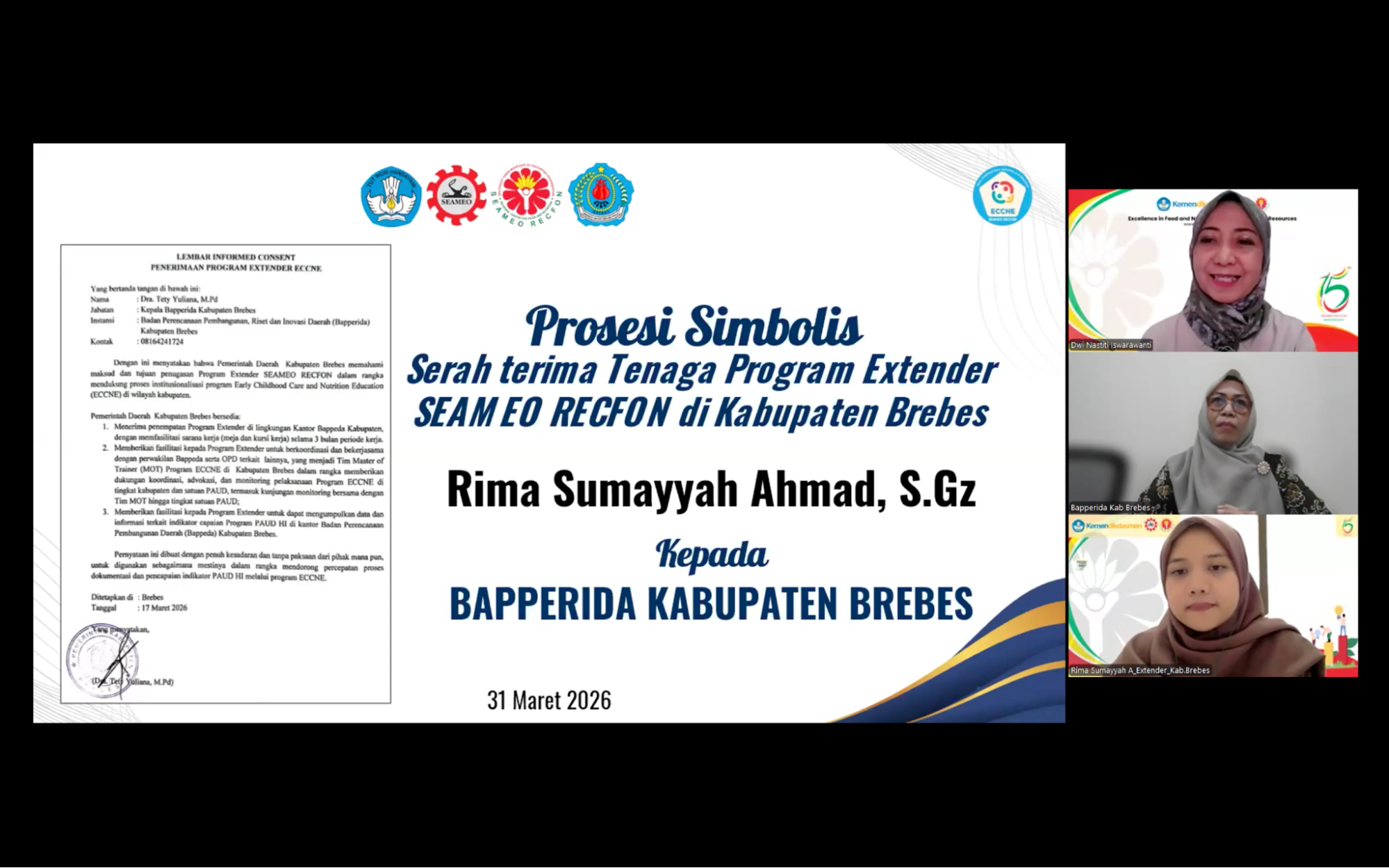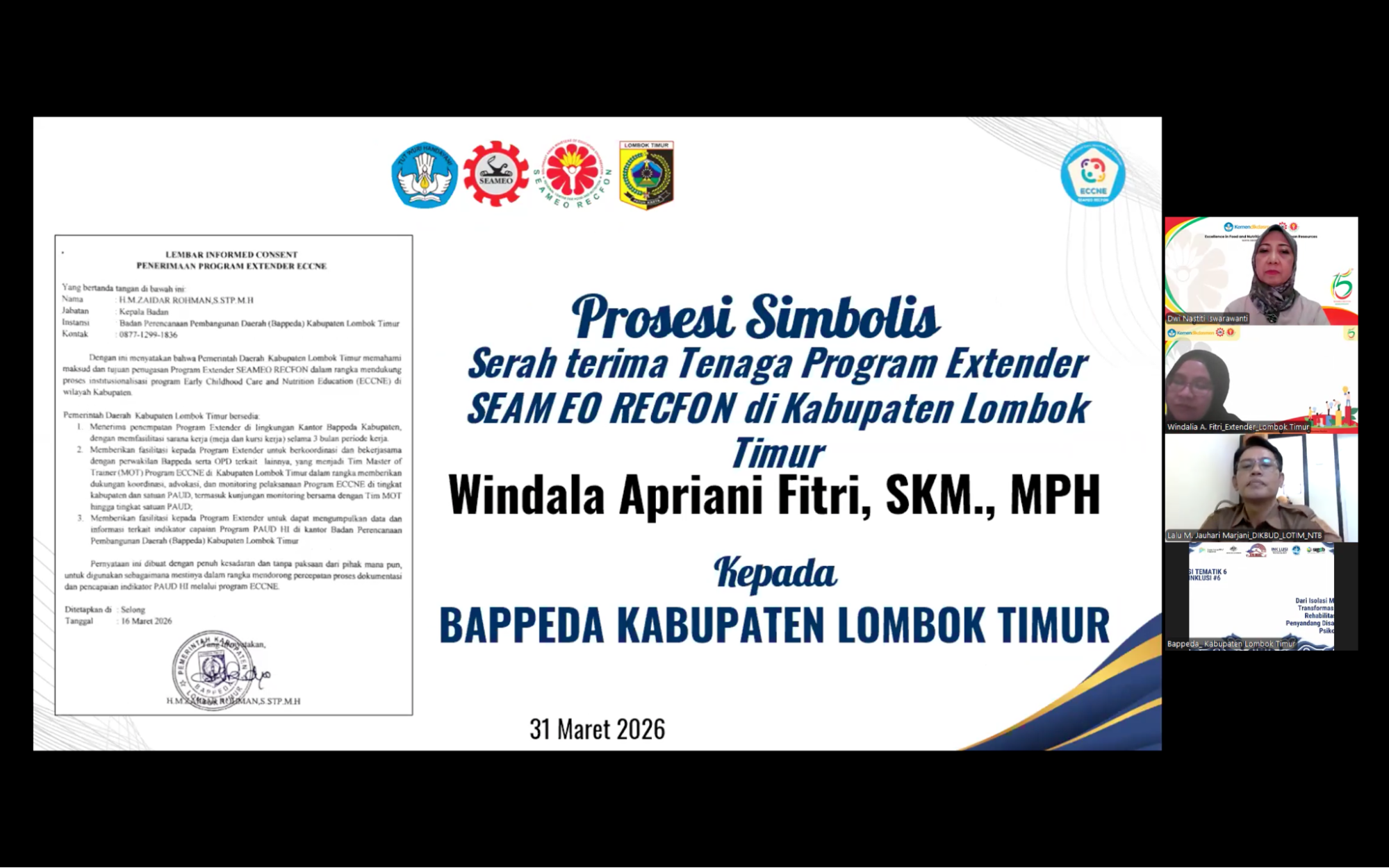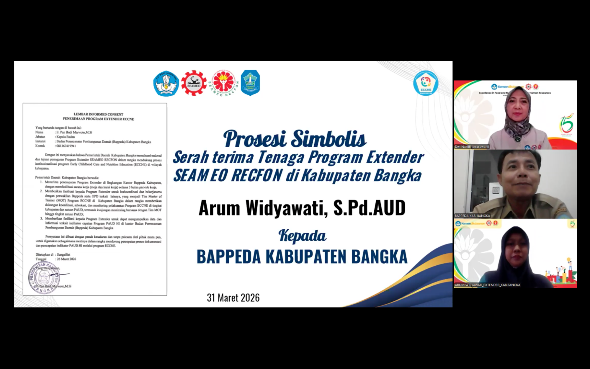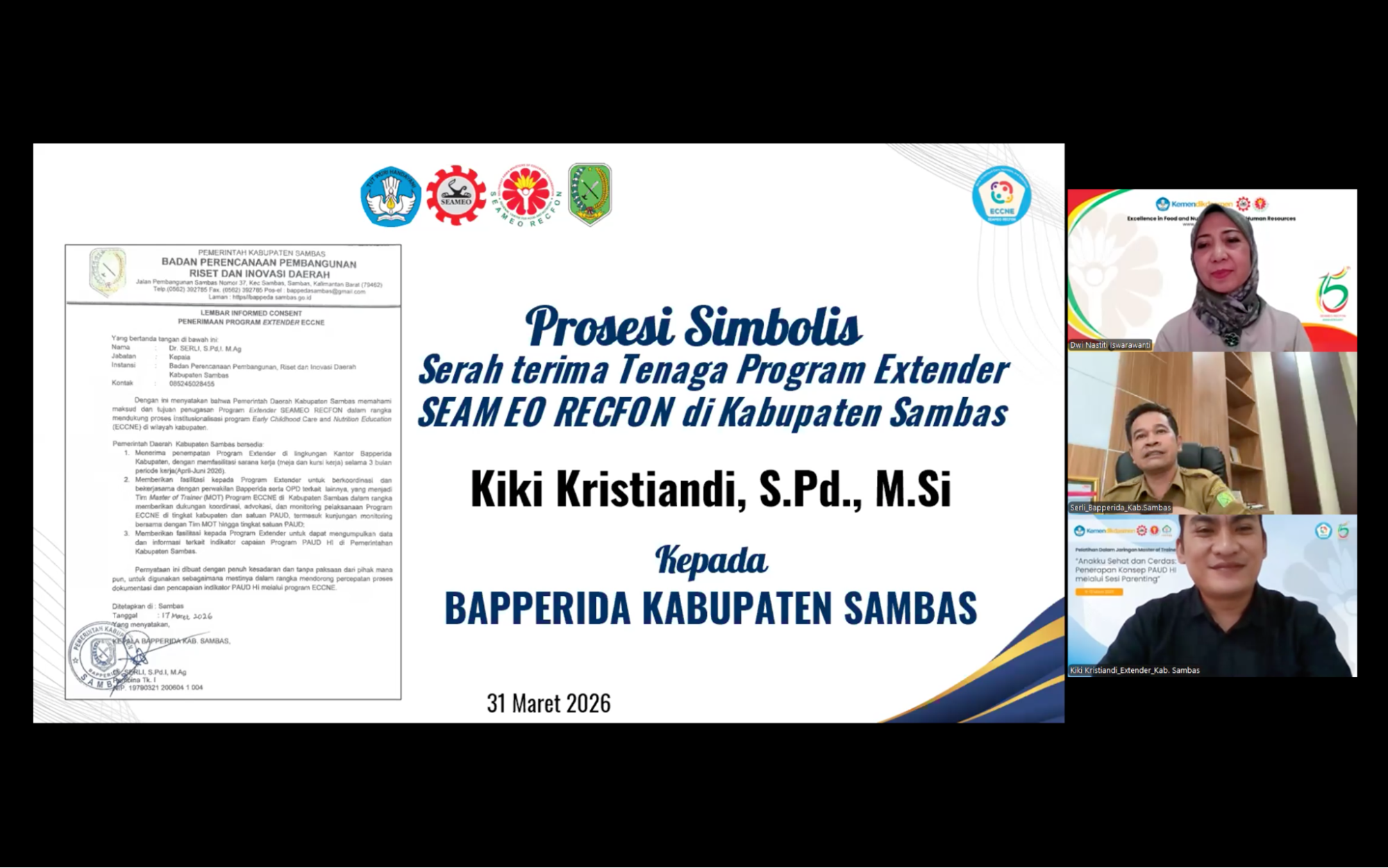 SEAMEO RECFON officially conducted the initiation of the Early Childhood Care, Nutrition, and Education (ECCNE) Program Extenders 2026 through an Onboarding virtual session on Tuesday, 31 March 2026, marking a pivotal milestone in strengthening multi-stakeholder collaboration across seven program locations i.e Bangka, Brebes, East Lombok, Pekalongan, Maros, Solok, and Sambas. The Extender Program assignment represents  a concrete implementation of the institution’s commitment to follow up the outcomes of the ECCNE Master of Trainer  (MoT) online training.