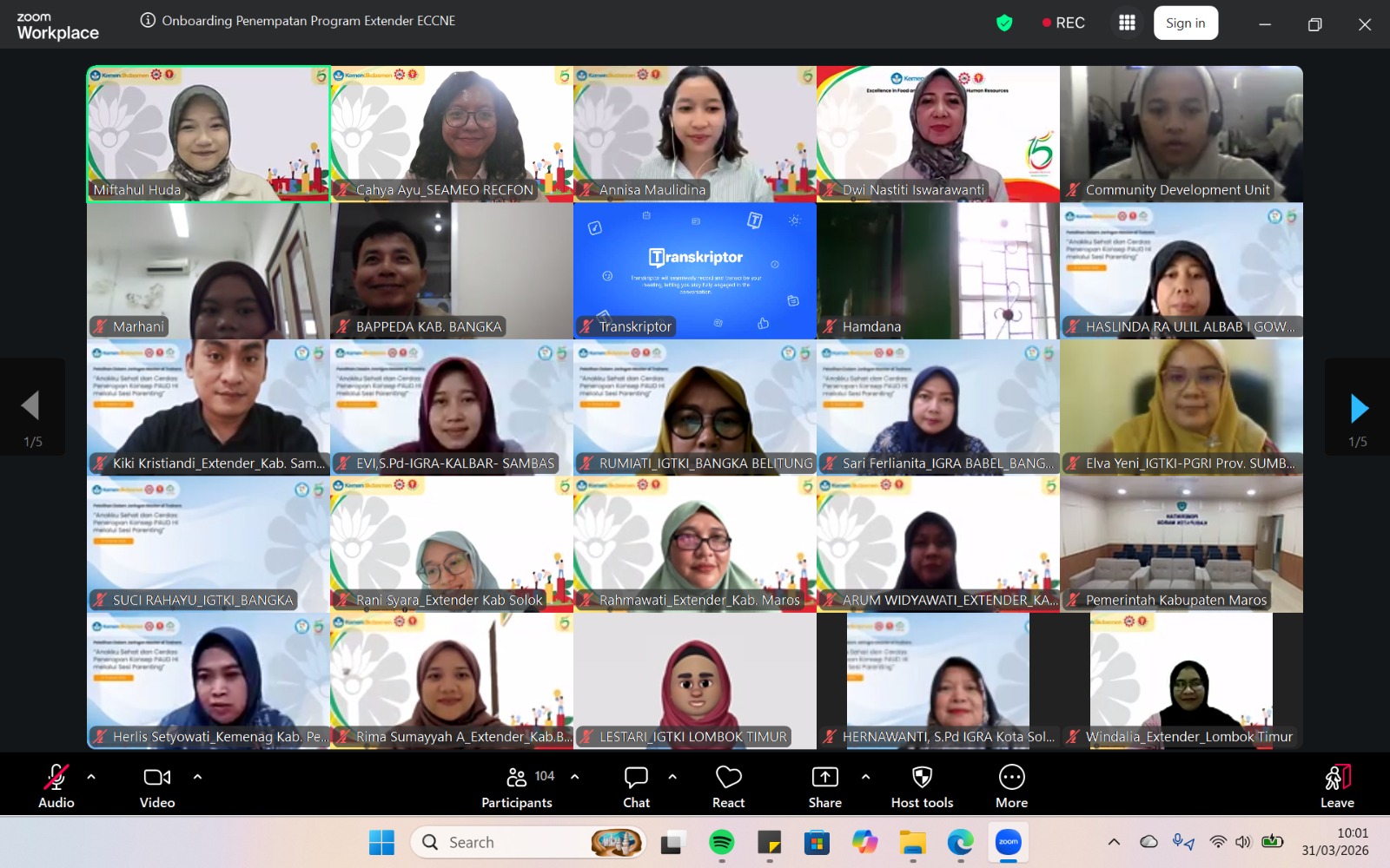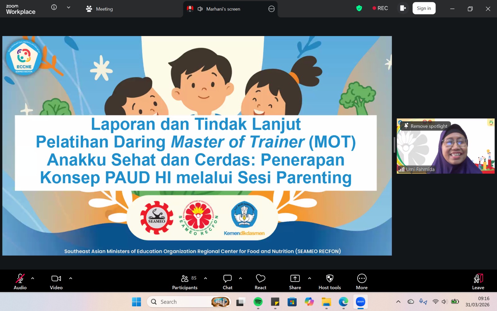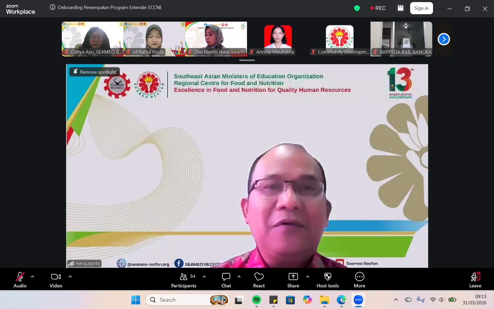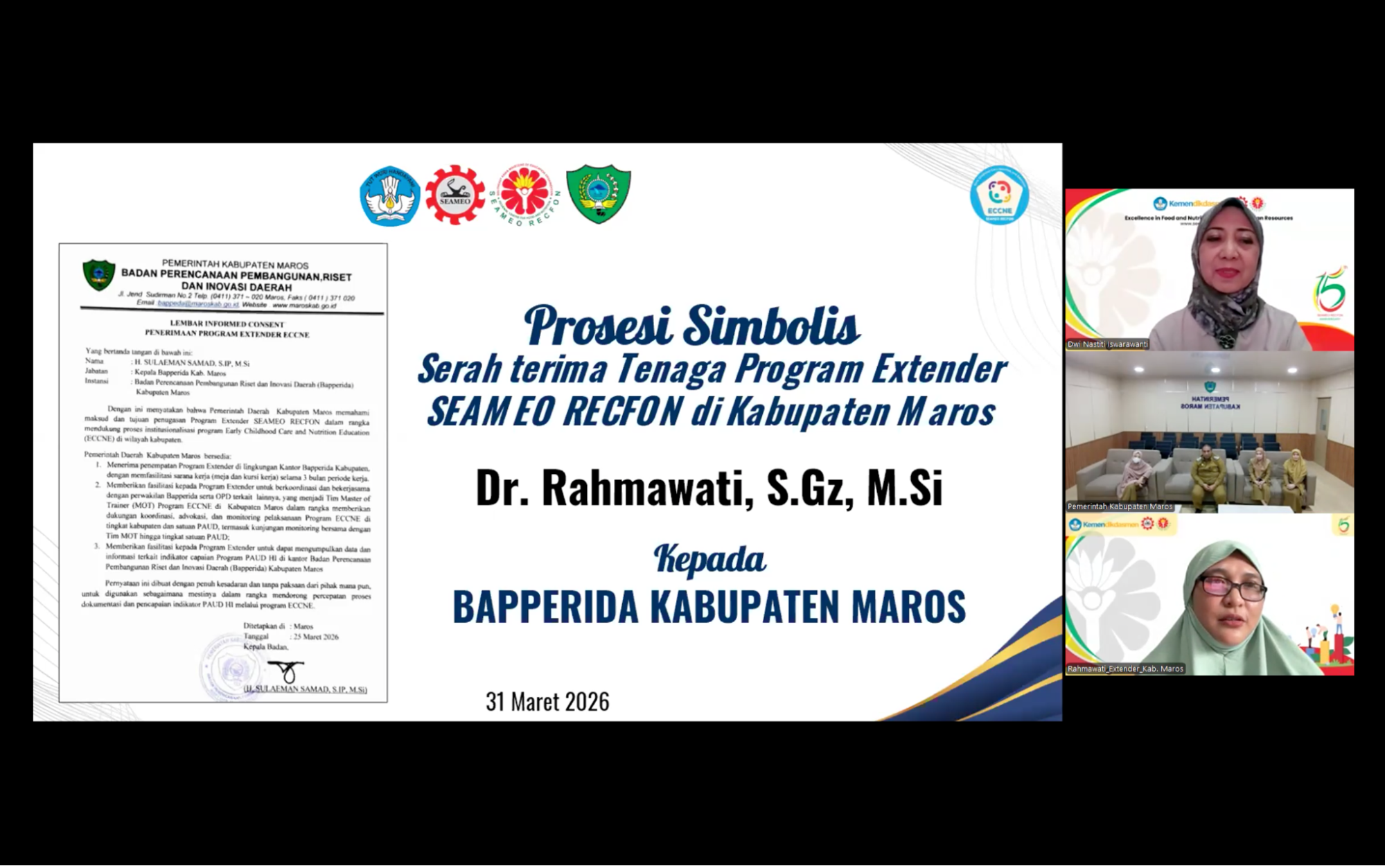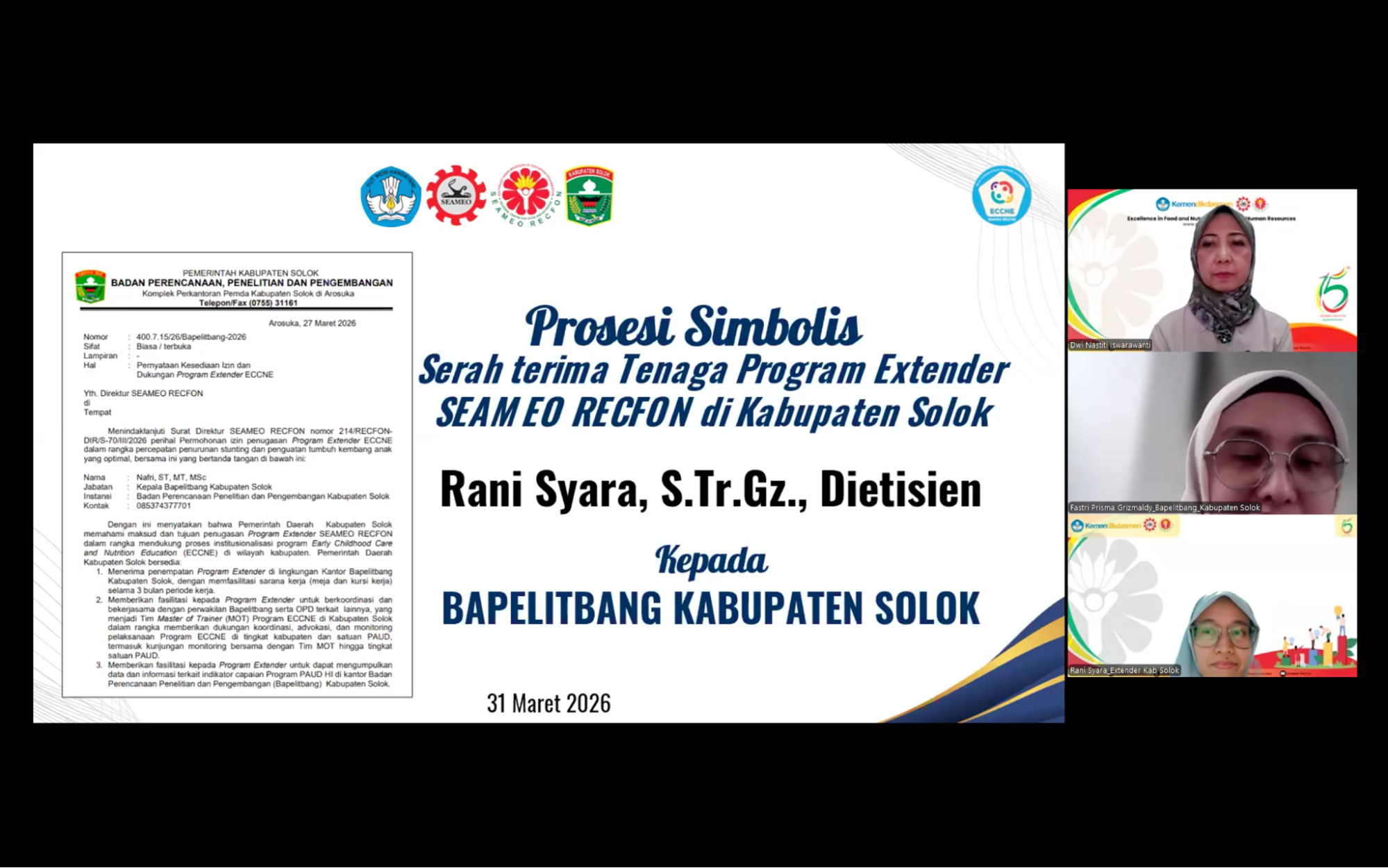 SEAMEO RECFON officially conducted the initiation of the Early Childhood Care, Nutrition, and Education (ECCNE) Program Extenders 2026 through an Onboarding virtual session on Tuesday, 31 March 2026, marking a pivotal milestone in strengthening multi-stakeholder collaboration across seven program locations i.e Bangka, Brebes, East Lombok, Pekalongan, Maros, Solok, and Sambas. The Extender Program assignment represents  a concrete implementation of the institution’s commitment to follow up the outcomes of the ECCNE Master of Trainer  (MoT) online training.
