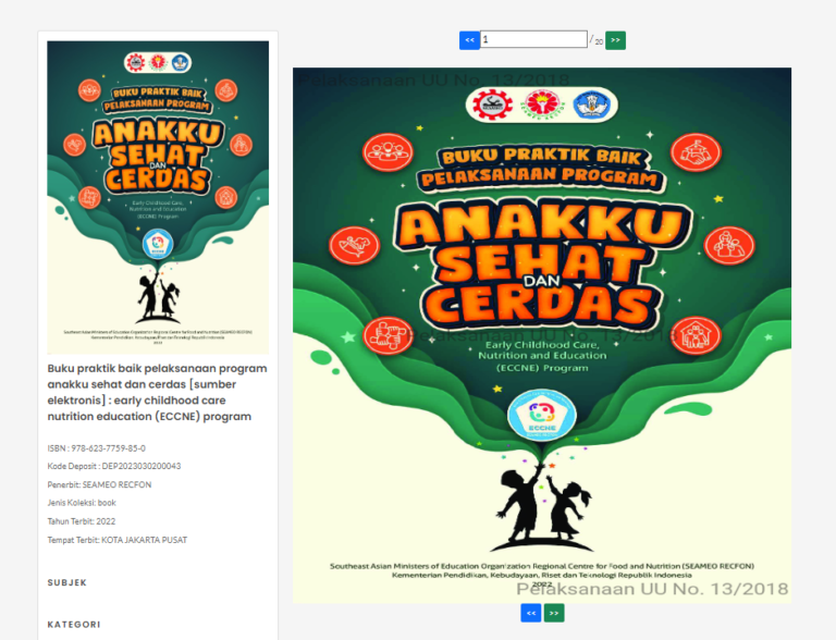 The e-book can be accessed for free at SEAMEO RECFON website (http://www.seameo-recfon.org/publications/books/#) and the National Library of the Republic of Indonesia website (https://edeposit.perpusnas.go.id/collection/buku-praktik-baik-pelaksanaan-program-anakku-sehat-dan-cerdas-sumber-elektronis-early-childhood-care-nutrition-education-eccne-program/113718#).