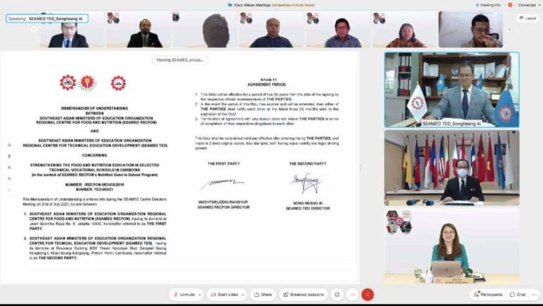 Recognizing the importance of food and nutrition in the total development of school children and adolescents, SEAMEO RECFON and the SEAMEO Regional Centre for Technical Education Development (TED) formalized their collaboration by signing a Memorandum of Understanding during the virtual SEAMEO Centre Directors Meeting on 22 July 2021.