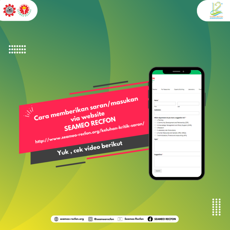 SEAMEO RECFON has a website that provides an Input & Suggestions feature which is useful for providing suggestions for improving SEAMEO RECFON programs and services. The purpose of the Input & Suggestions feature is to make it easier for stakeholders, teachers, and also the community to provide suggestions or input for the improvement of SEAMEO RECFON programs and services, which are implemented by 7 units consist of: